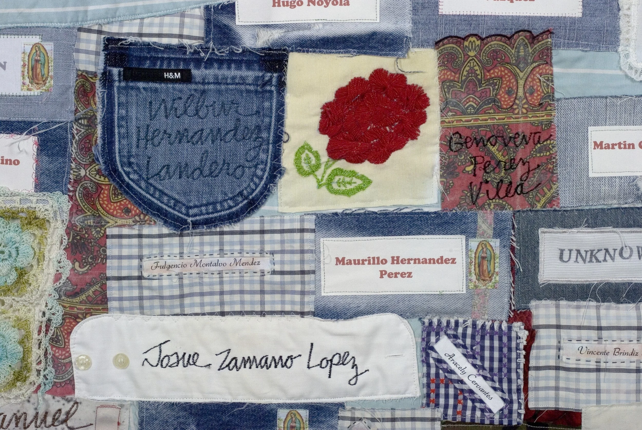 Fabric inspires me. I love to collect it and stitch quilts, bags and other objects from my stash of new and vintage cloth. But when the opportunity arose to collaborate with Suzanne Hesh and Alice Vinson to create a Migrant Quilt, I encountered fabric as something other than pretty designs and colors. To me, the discarded items of clothing from which we were to sew this unique quilt still contained vestiges of the spirits of the people who had worn them and later discarded them on their journeys north to what they hoped would be a better life in the United States. It was a humbling and emotionally-fraught experience to handle the shirts, jeans, bandanas and embroidered serviettes that were left behind, and then to deconstruct them and reconnect the pieces into the form of a quilt documenting the demise of fellow travelers whose dreams were cut short in the inhospitable deserts surrounding Tucson. I had never worked on such an evocative art object or been involved in such a meaningful act of consciousness-raising. Thank you for allowing me to be a part of the Migrant Quilt Project.